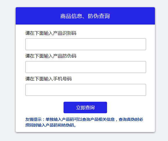 商品信息防伪查询系统定制版,单独输入产品码可以查询产品相关信息,查询真伪时必须同时输入产品码和防伪码。
